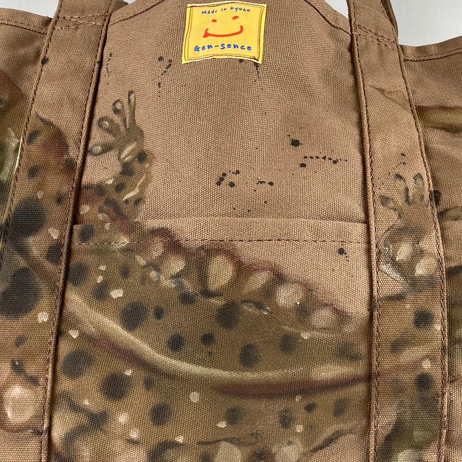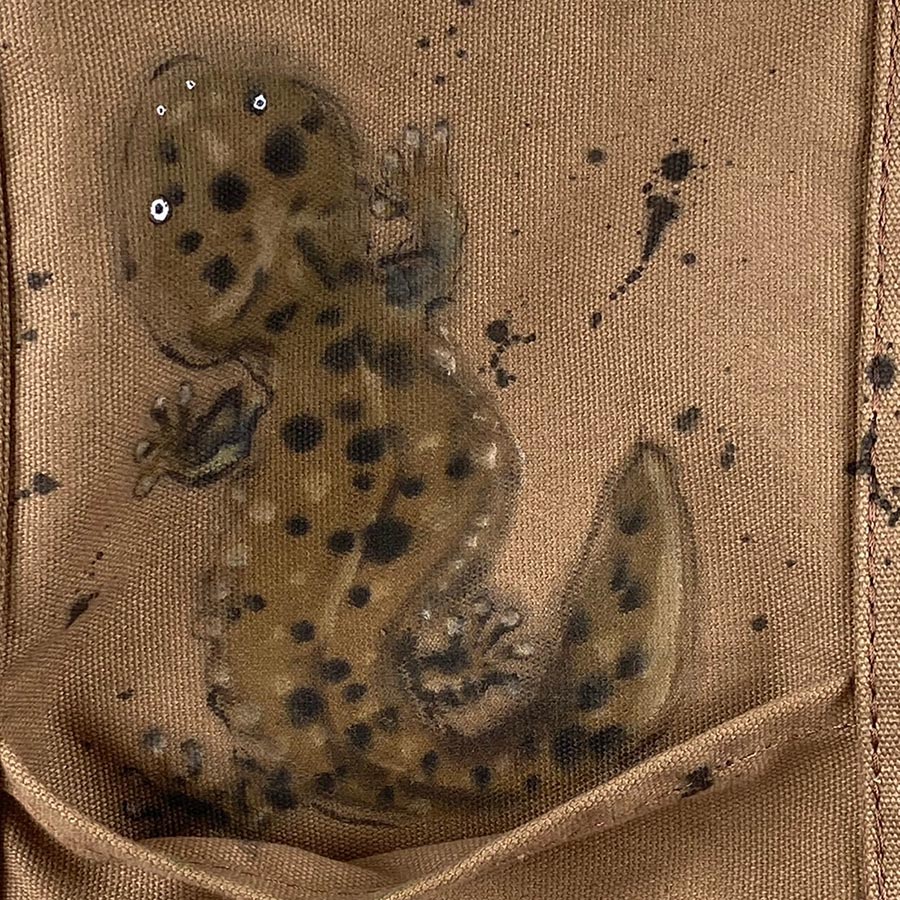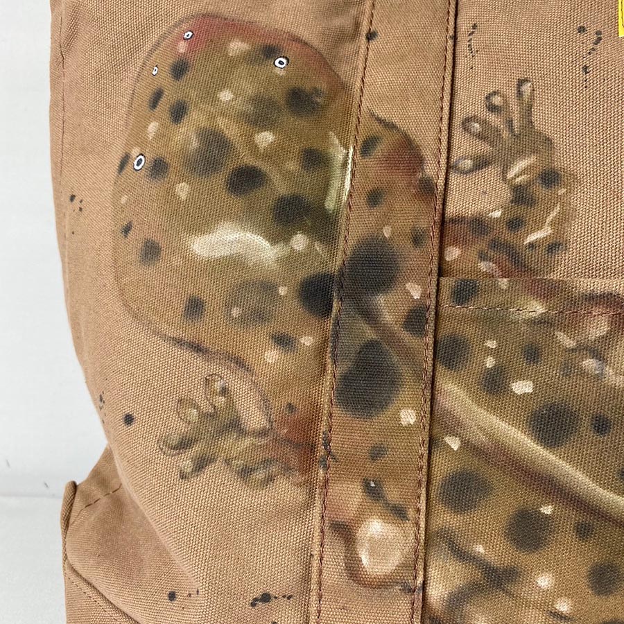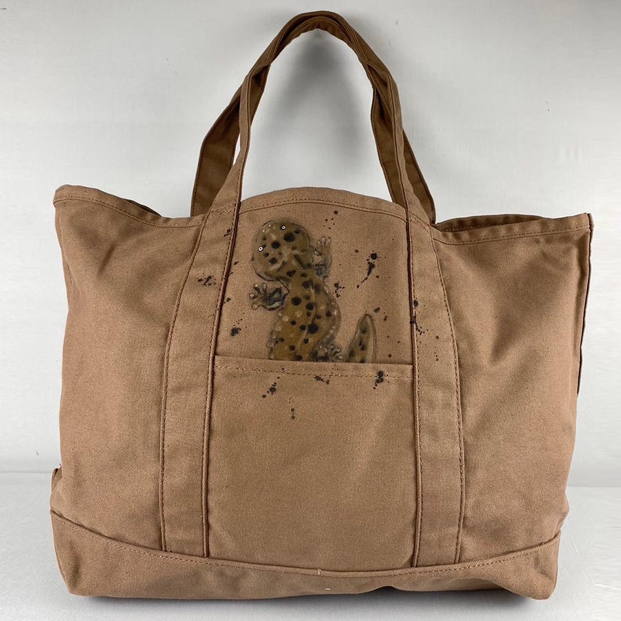 バサッと肩に掛けてラフにご使用いただける大き目のトートに、大きなオオサンショウウオとポケットから小さなオオサンショウウオがちょこんと出ているデザインが楽しい作品です。