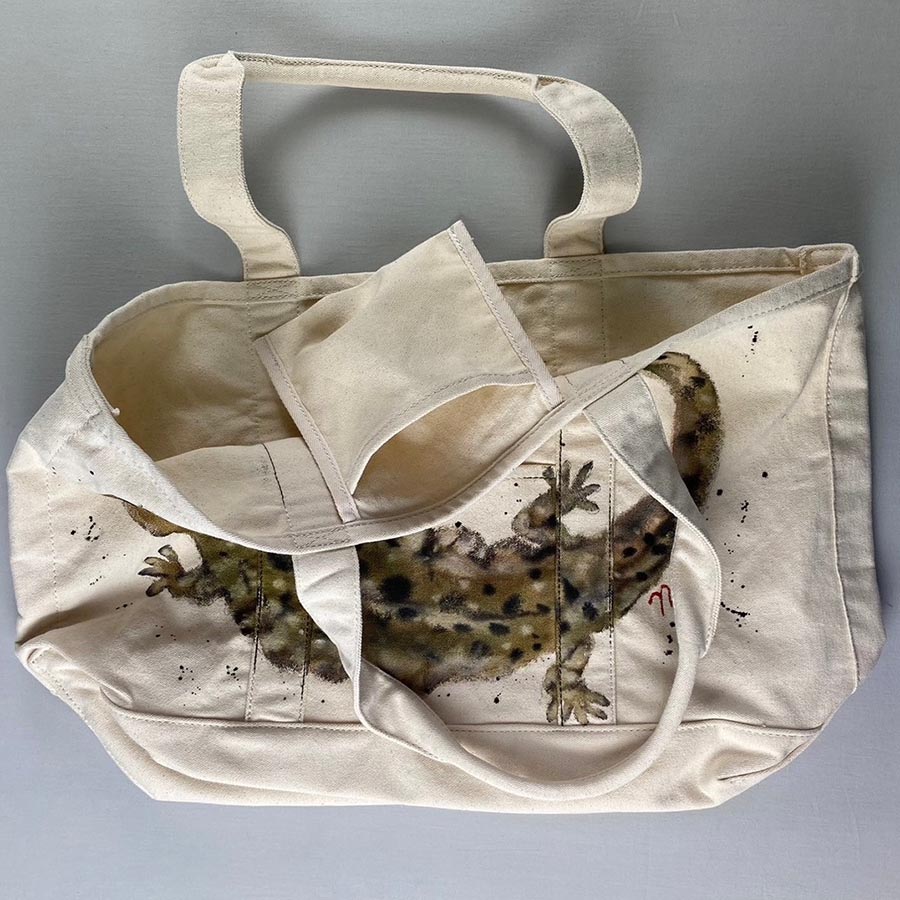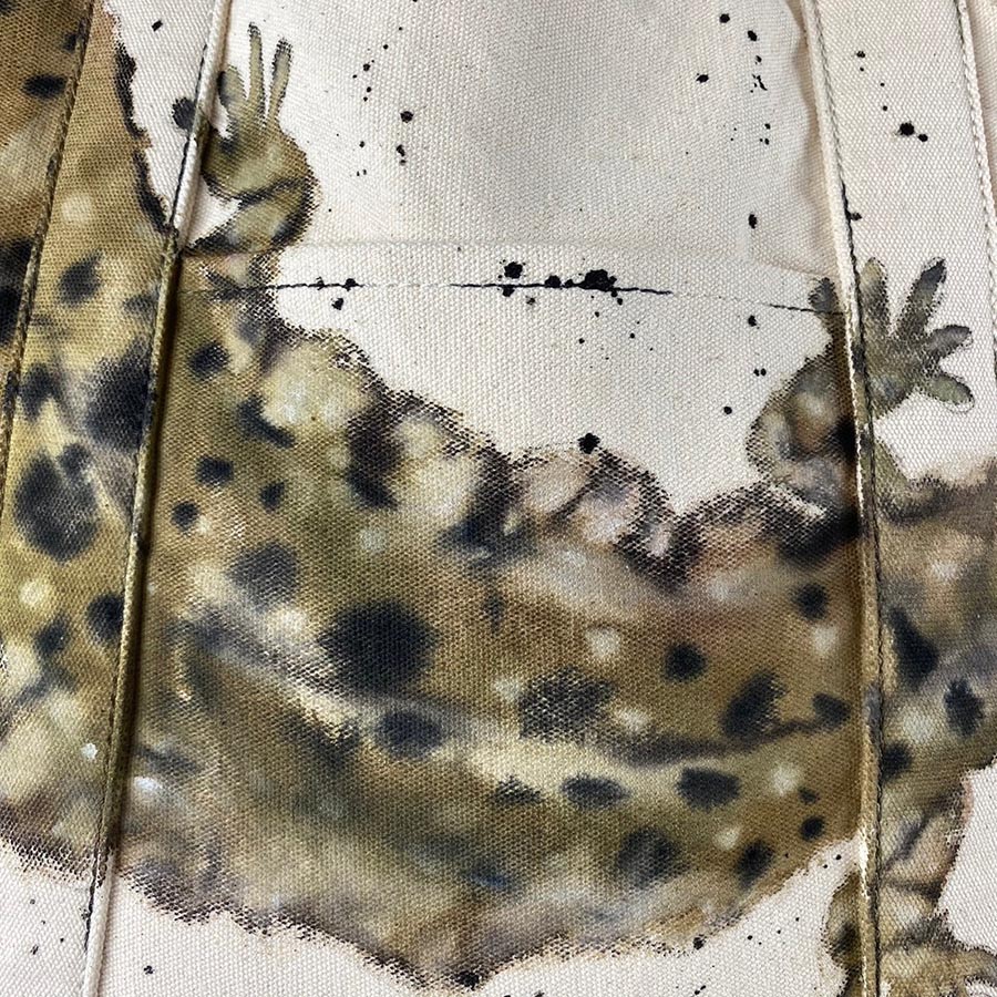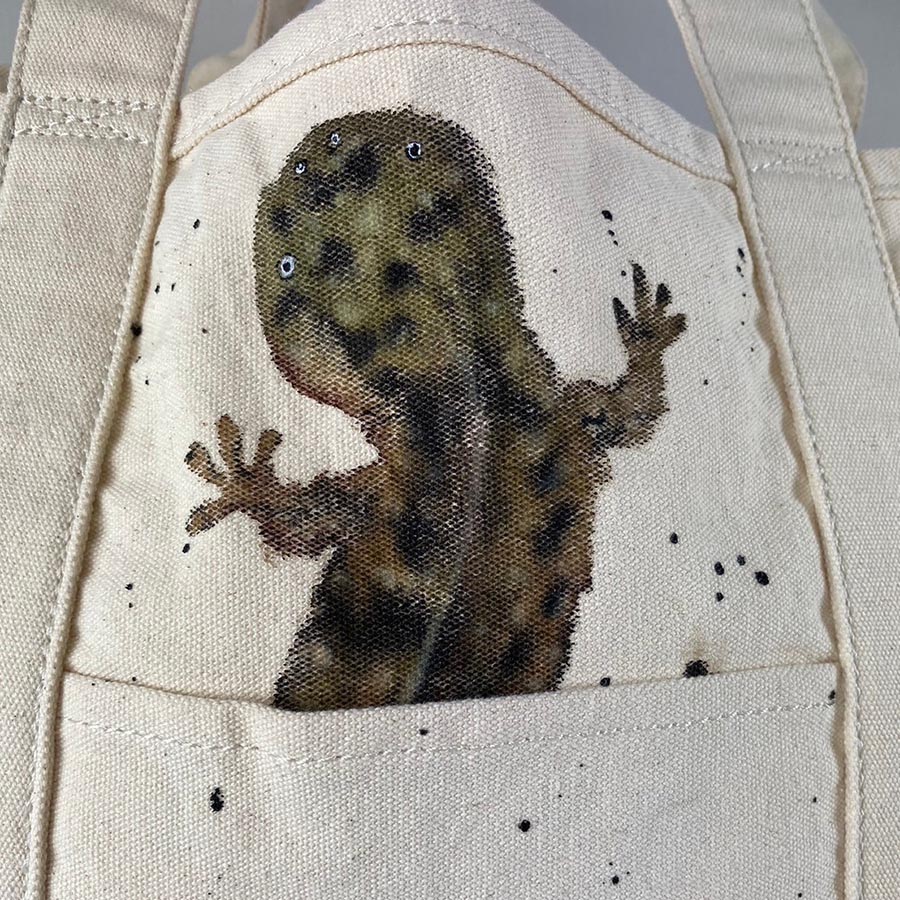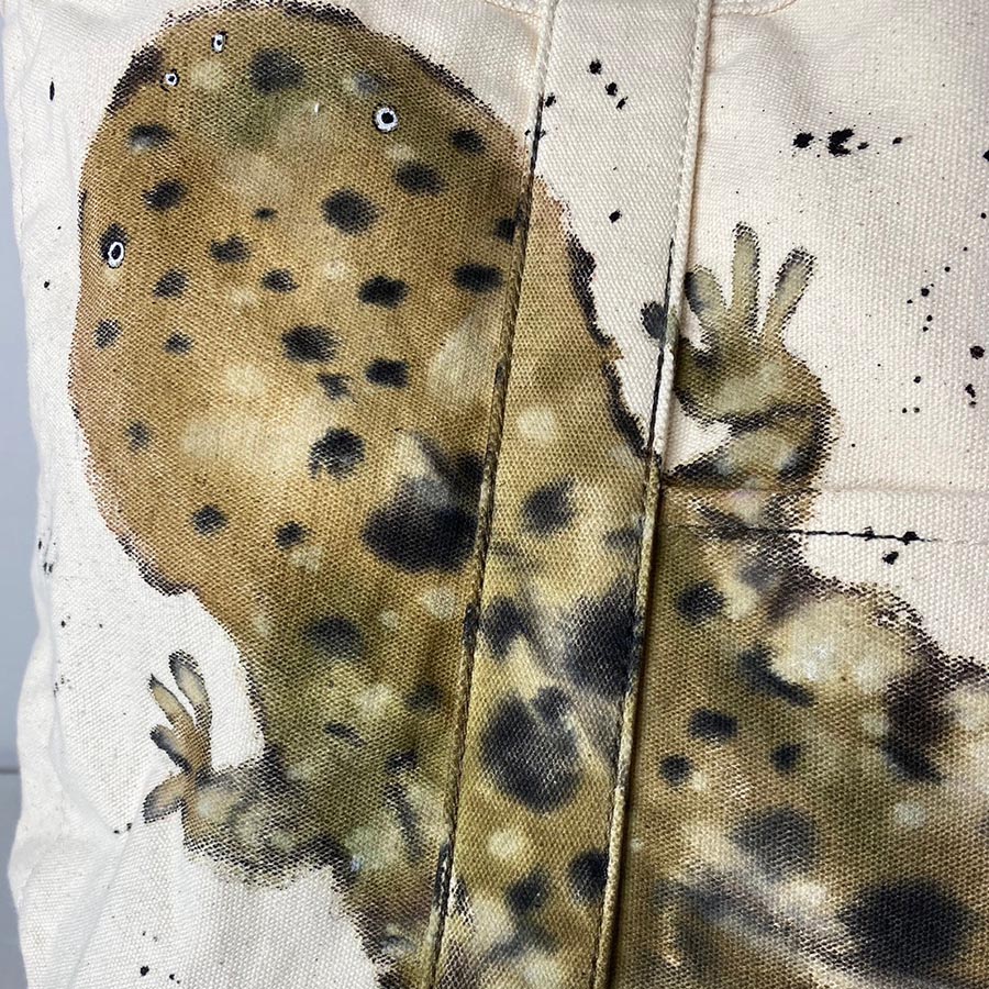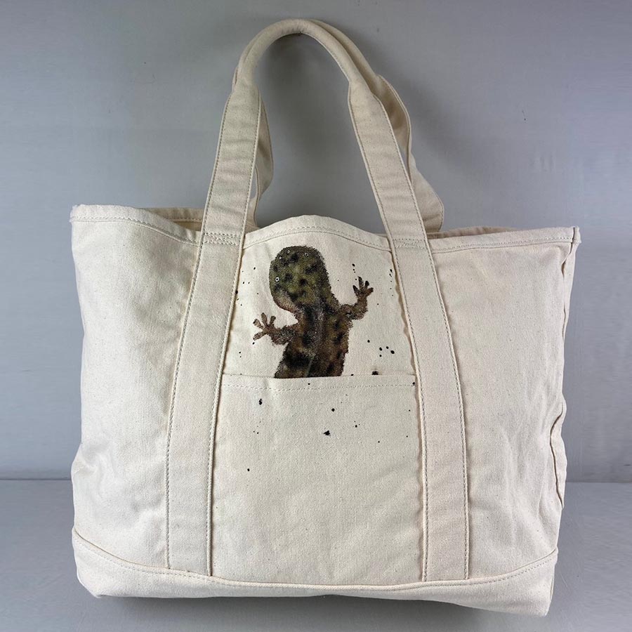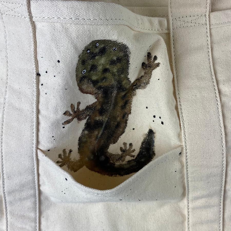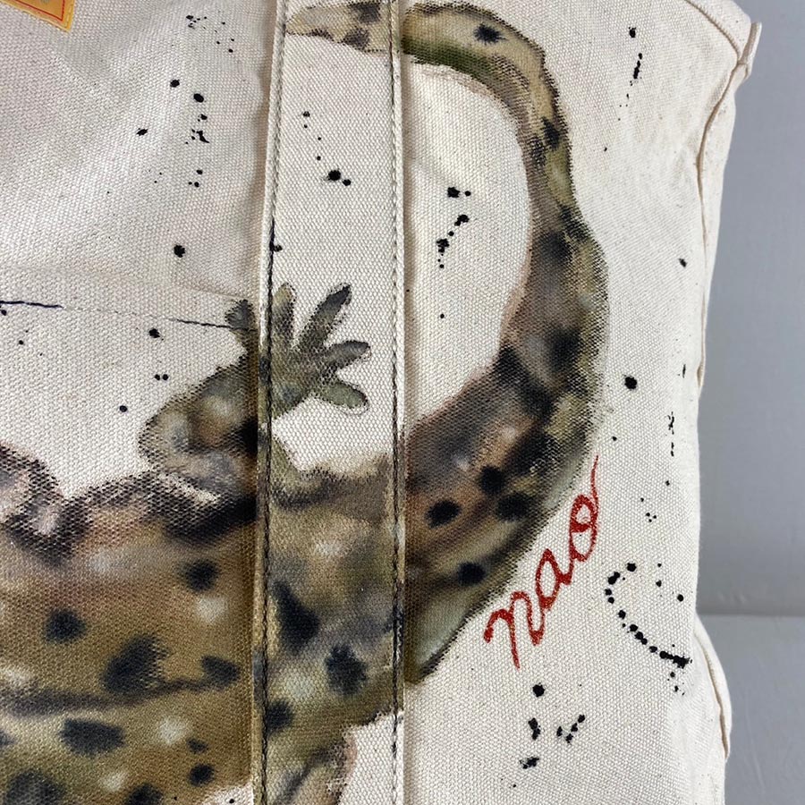 バサッと肩に掛けてラフにご使用いただける大き目のトートに、大きなオオサンショウウオとポケットから小さなオオサンショウウオがちょこんと出ているデザインが楽しい作品です。