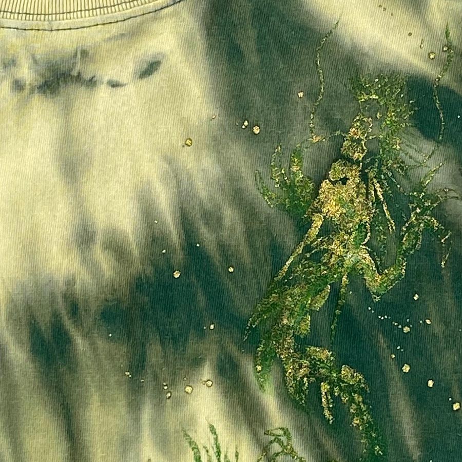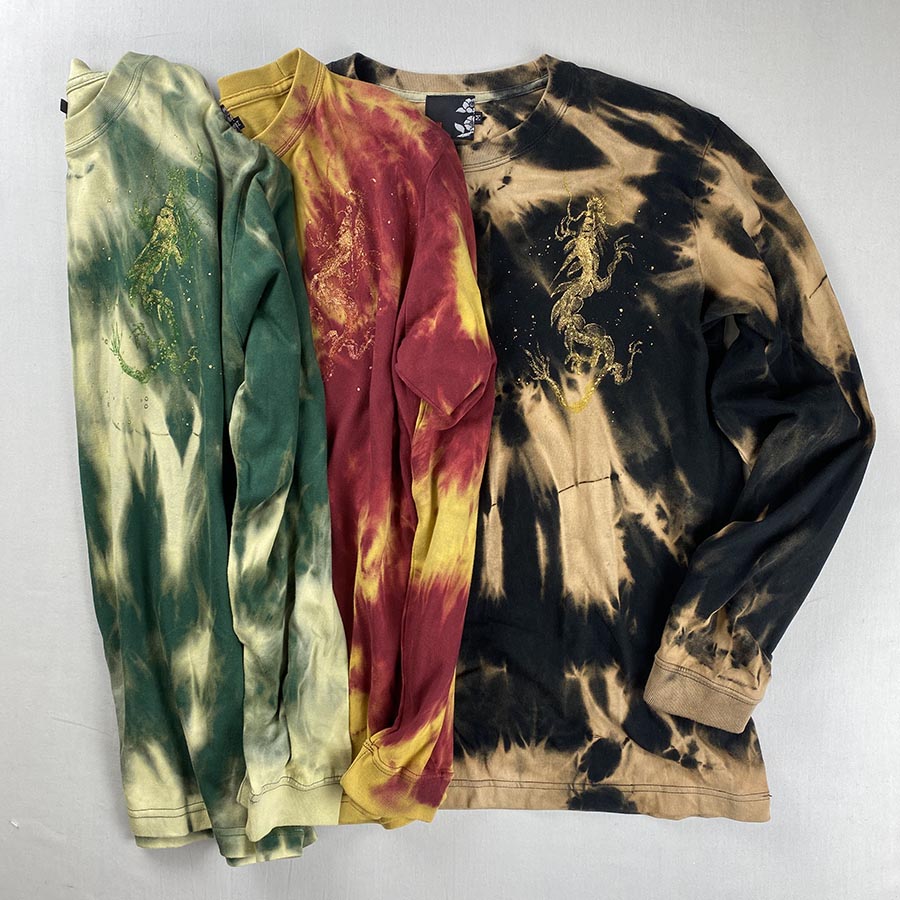 一枚一枚アイビーグリーンの長袖Tシャツを籠抜染し、そこにゴールドの龍を手描き致しました。