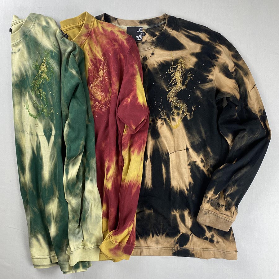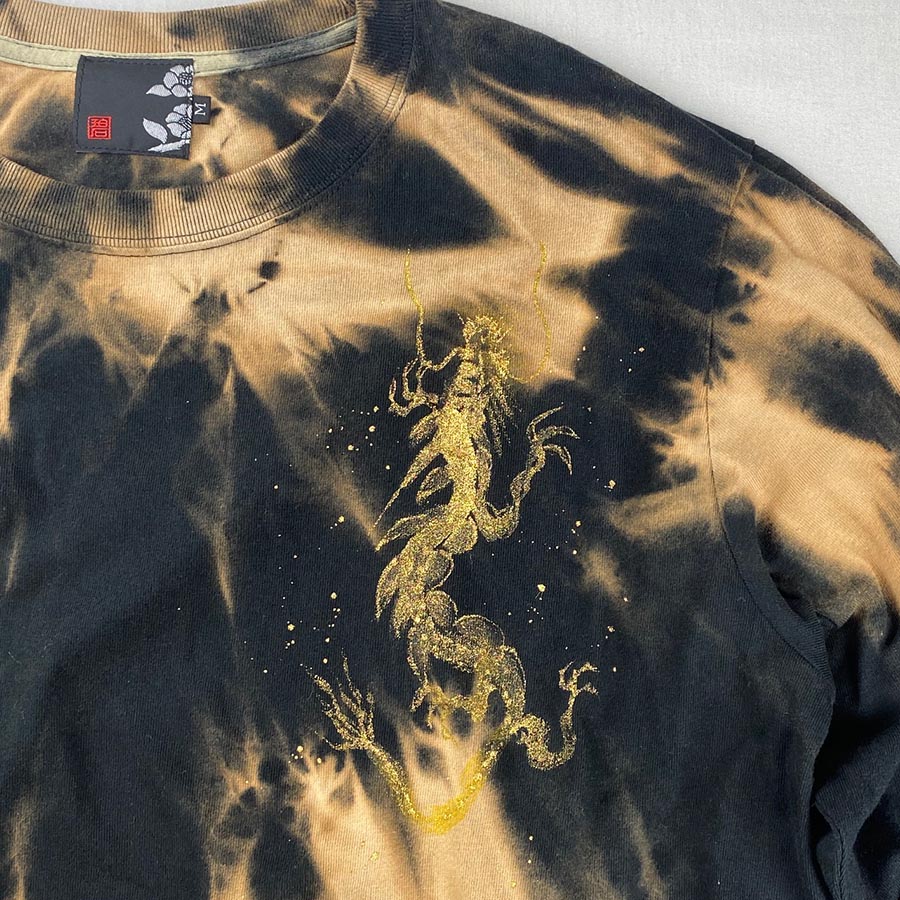 一枚一枚 黒の長袖Tシャツを籠抜染し、ゴールドの龍を手描き致しました。