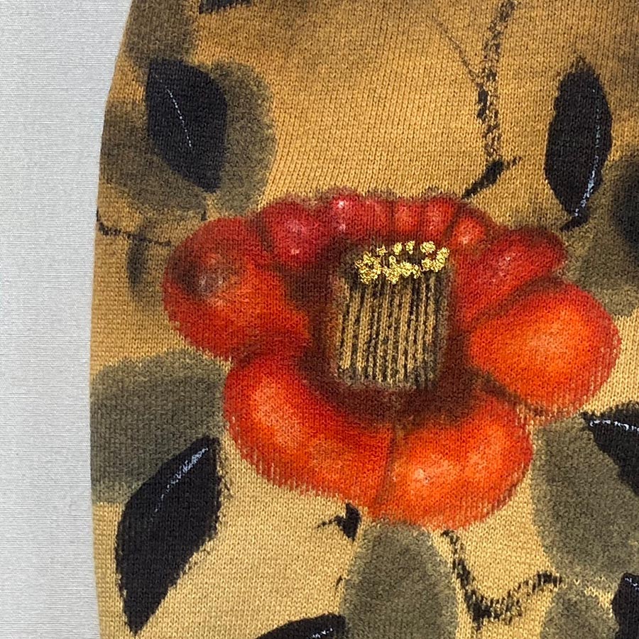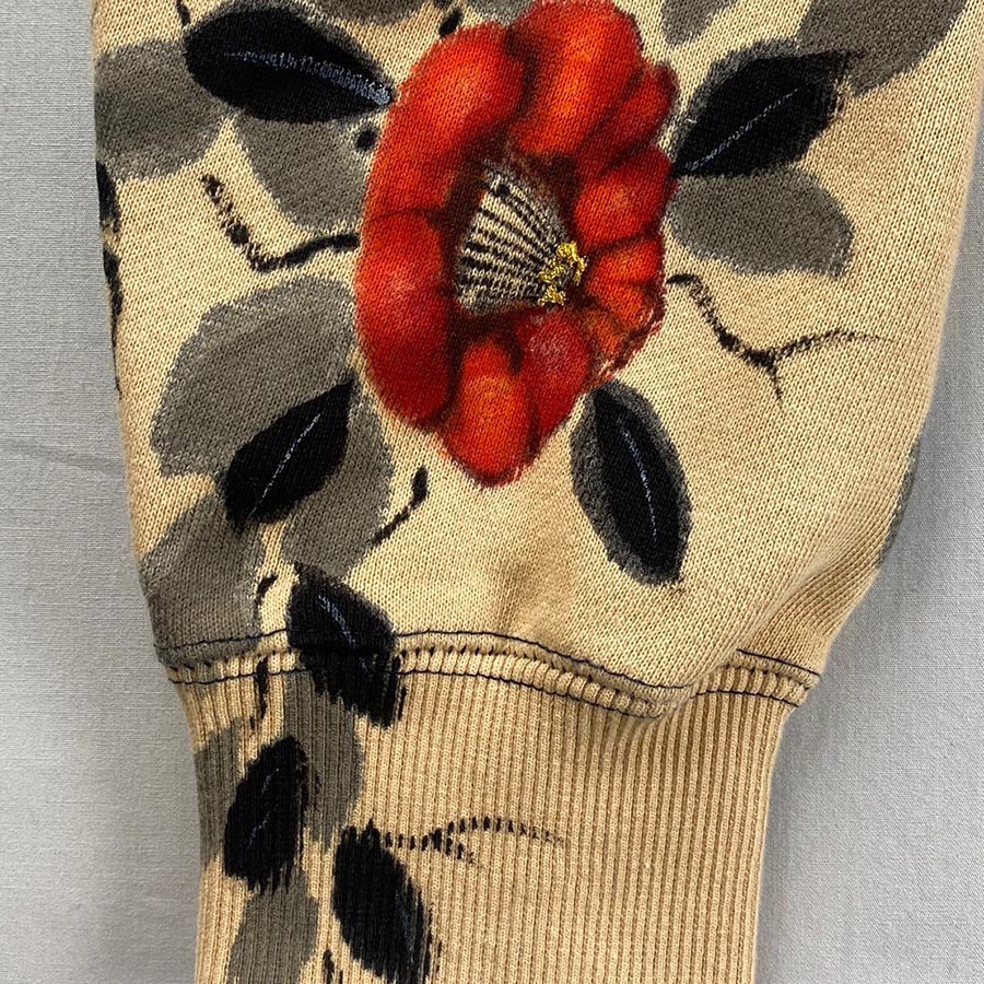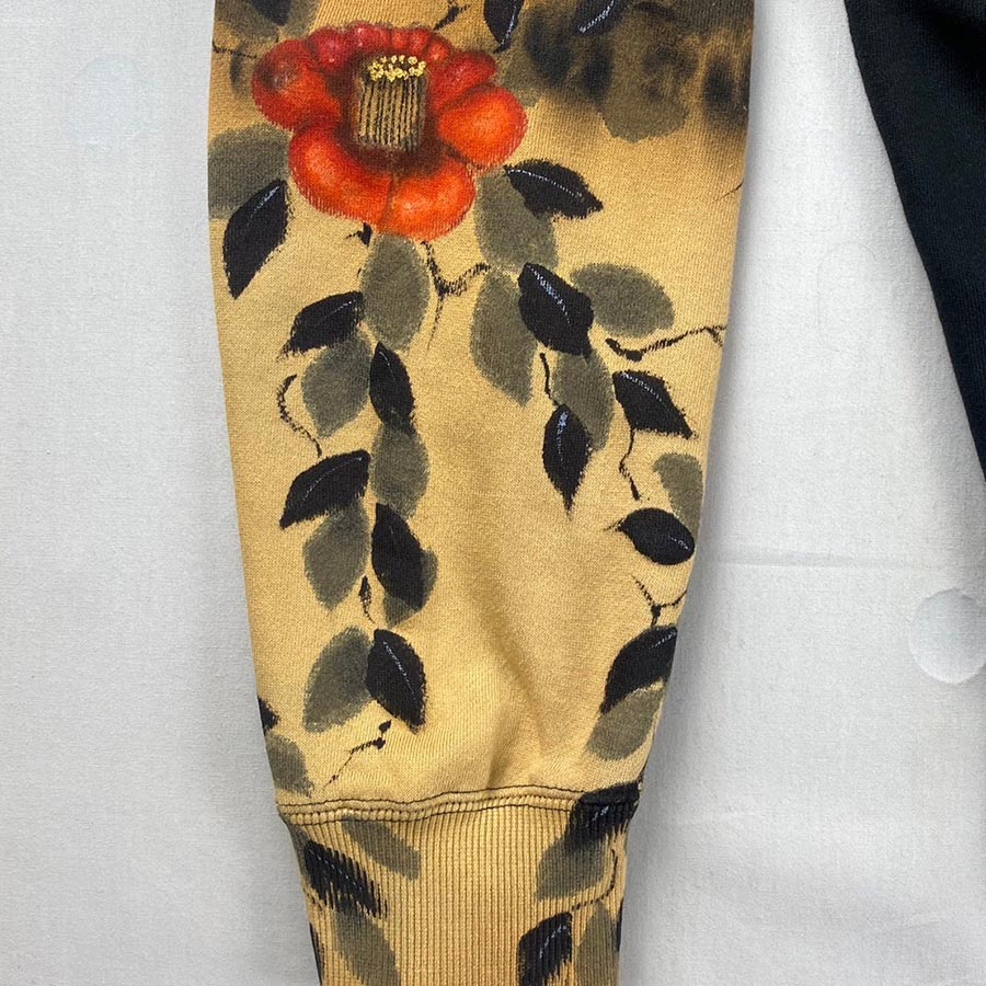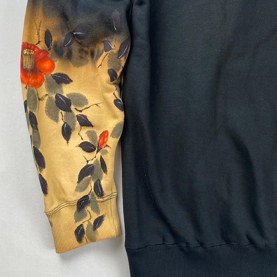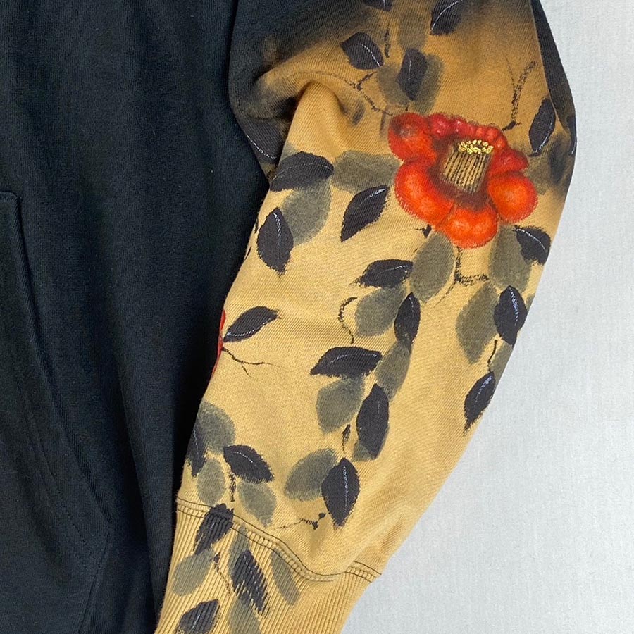黒のパーカーの左袖の一部だけ色を抜く抜染加工を施し、赤い椿を咲かせました。