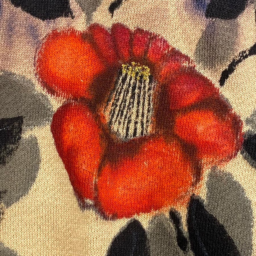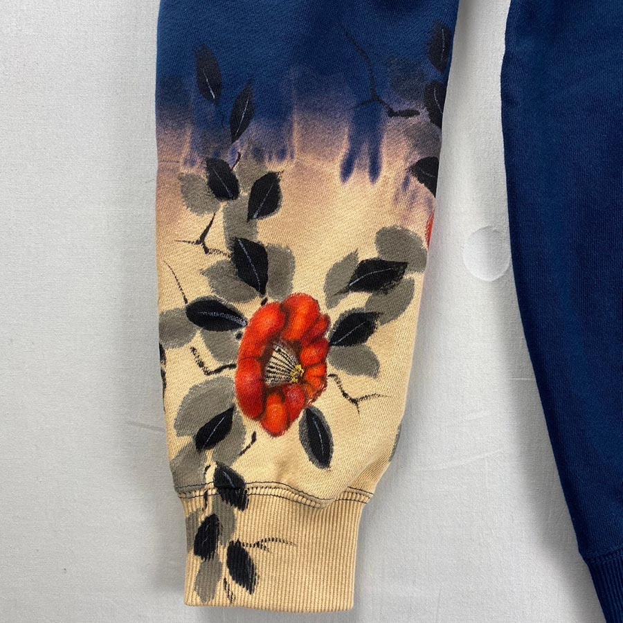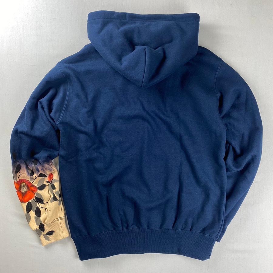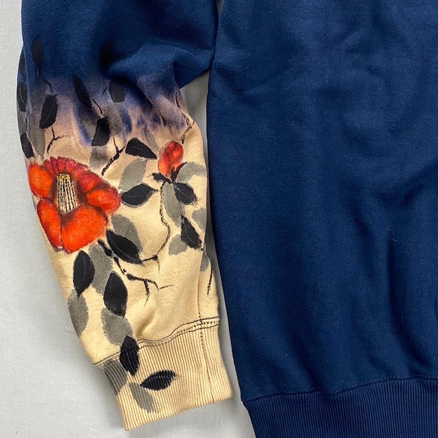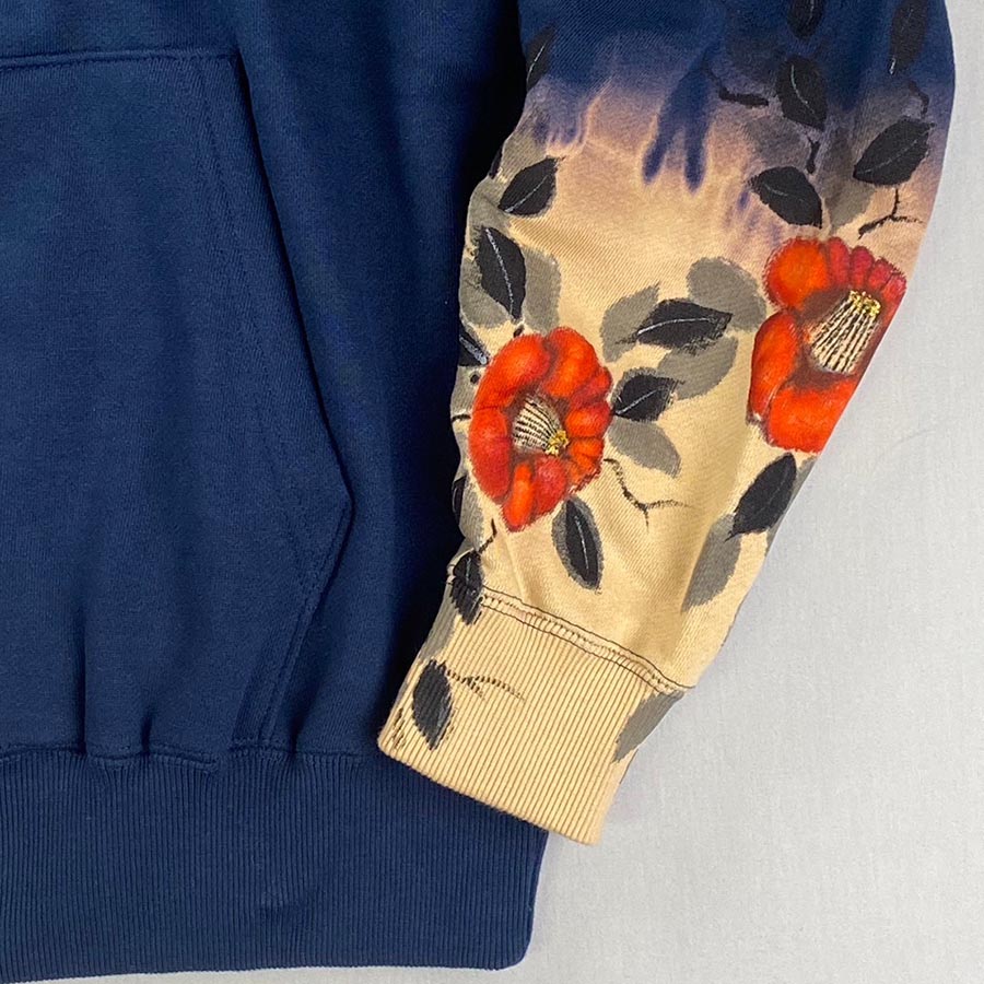 ネイビーのパーカーの左袖の一部だけ色を抜く抜染加工を施し、赤い椿を咲かせました。