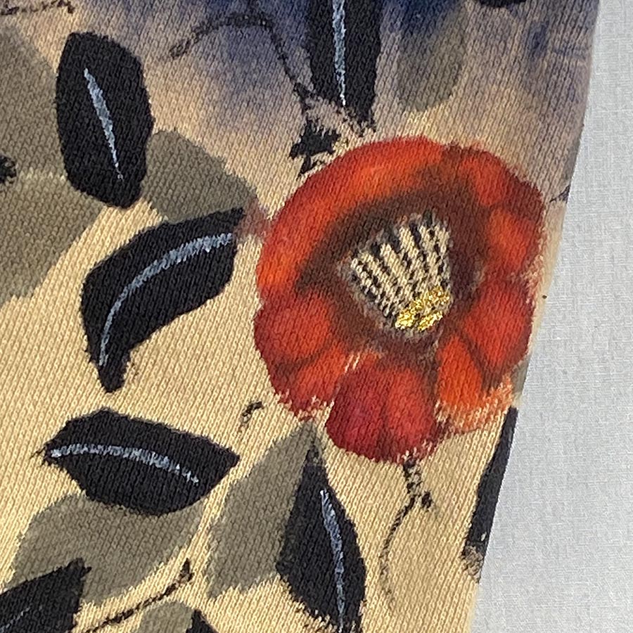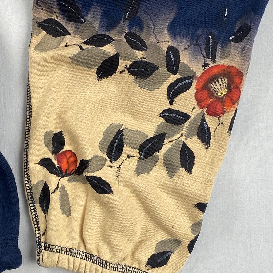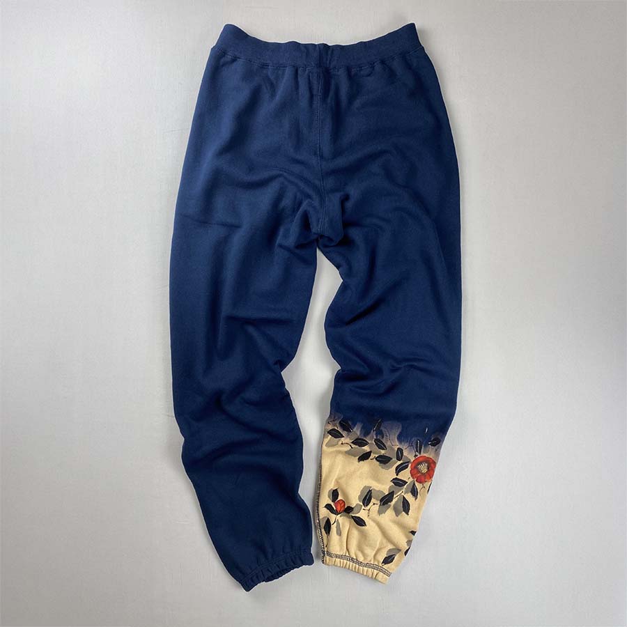 ネイビーのパンツの右裾の一部だけ色を抜く抜染加工を施し、赤い椿を咲かせました。