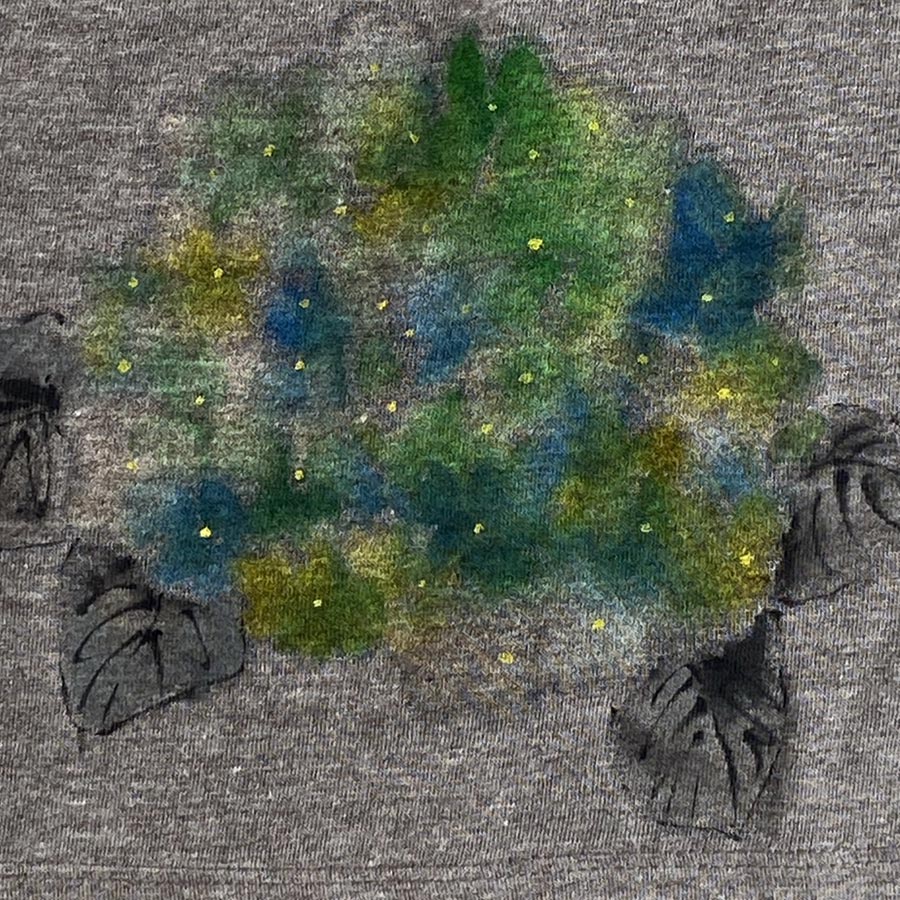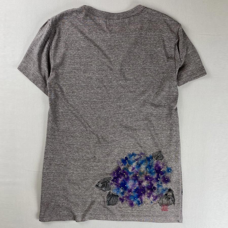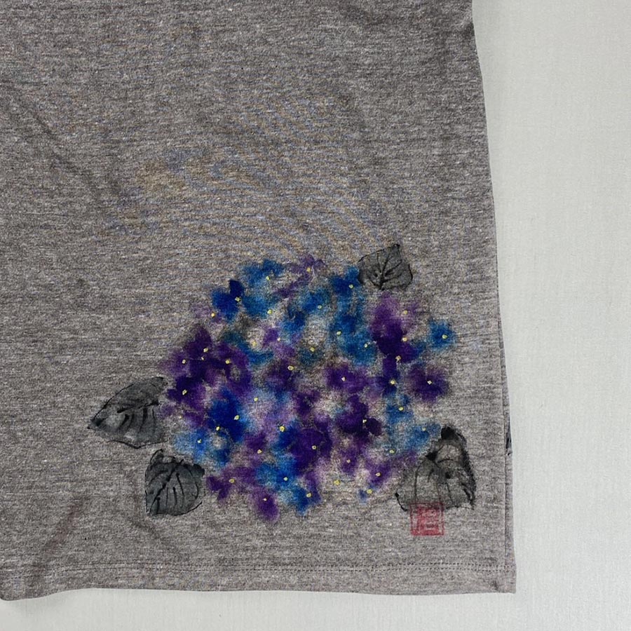 着用していただきやすいTシャツの色味に、にじみが美しい紫陽花を描きました。
