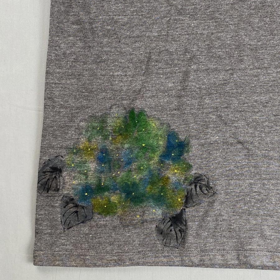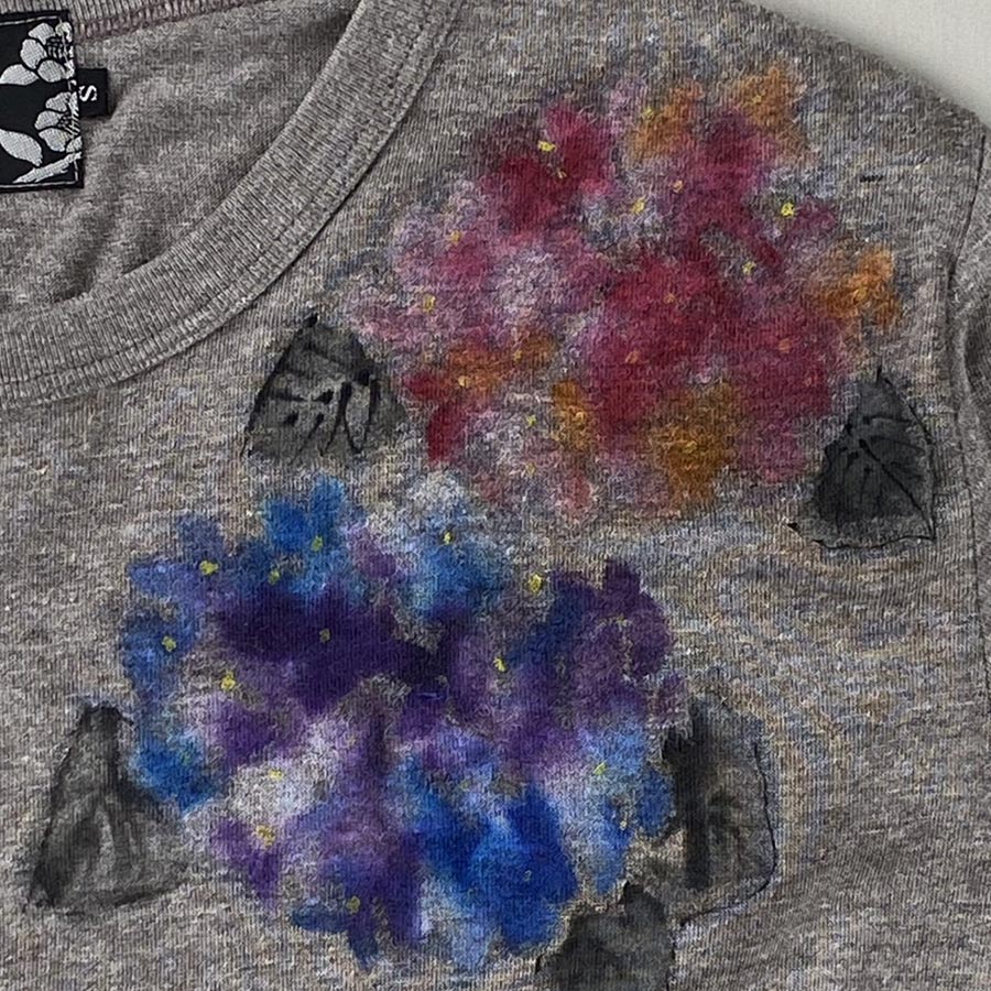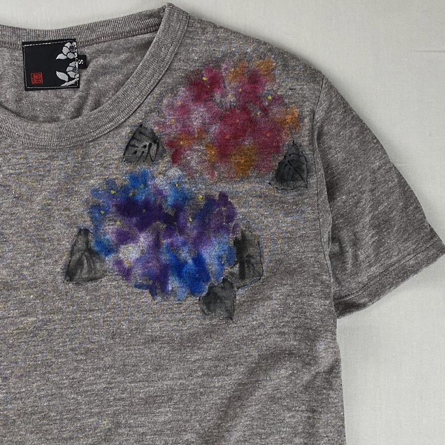赤系、ブルー系、グリーン系と様々なカラーの紫陽花ですが、作家特有のにじみがTシャツの色味にフィットしていて、鮮やかすぎず、落ち着いた色味を楽しんでいただけます。