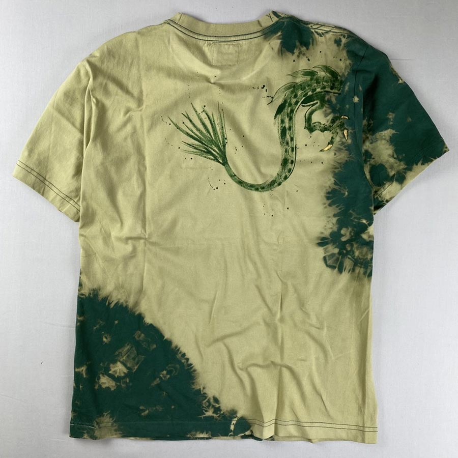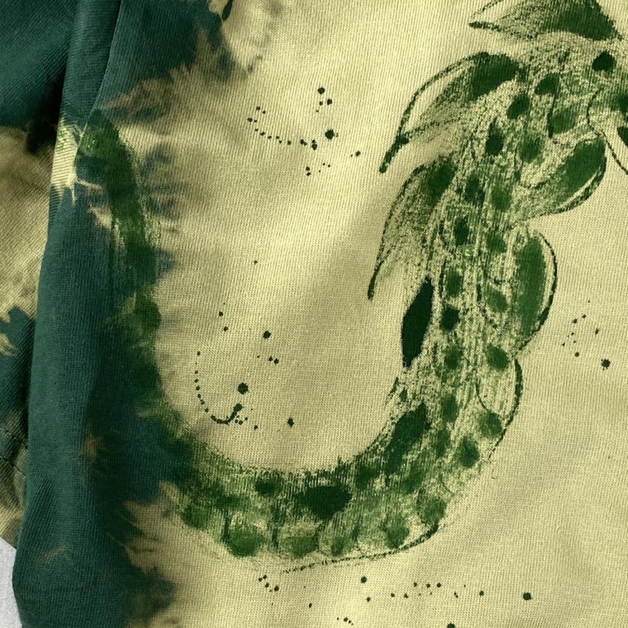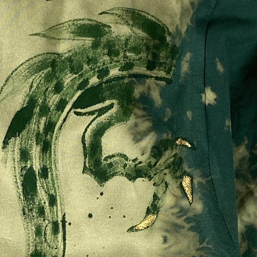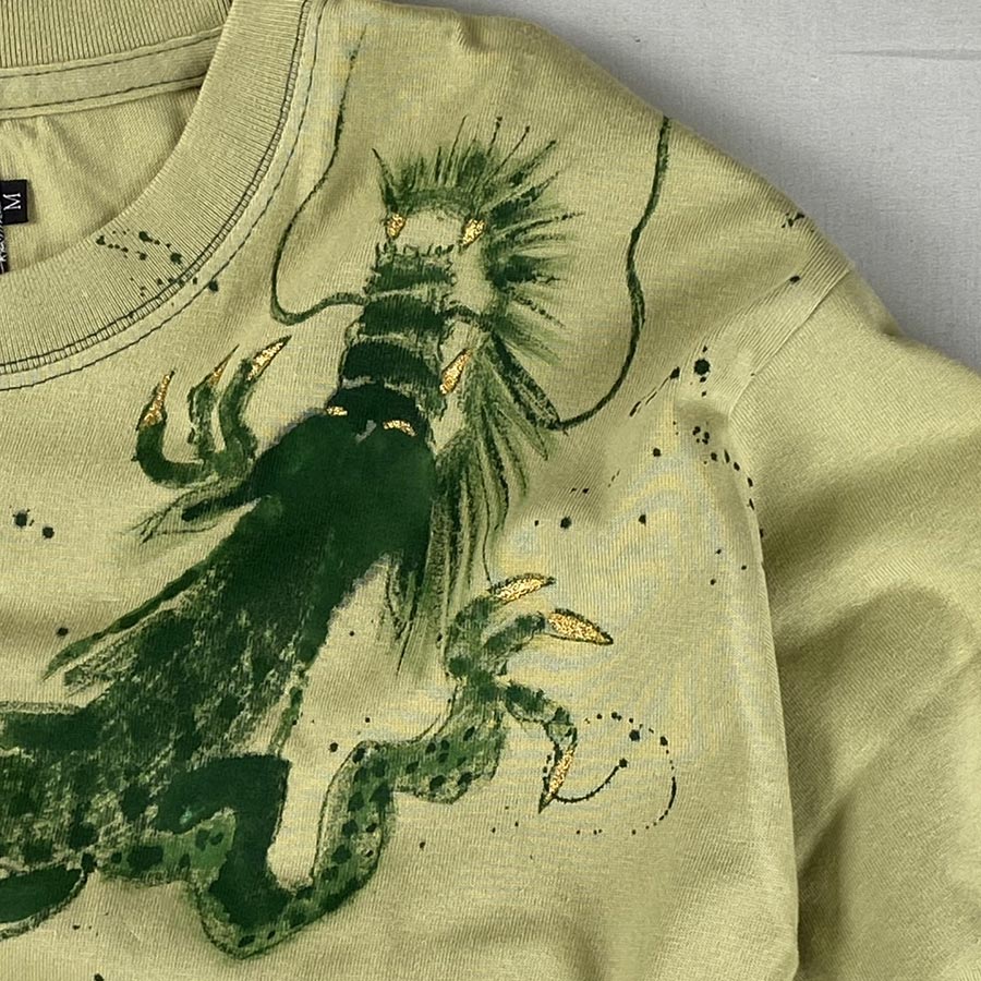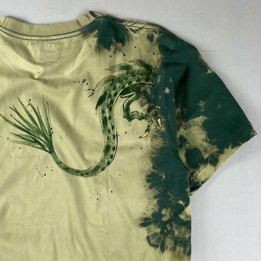 一枚一枚Tシャツを手で絞って抜染加工し、雲の中を泳ぎ天に昇っていく龍をイメージして手描き致しました。